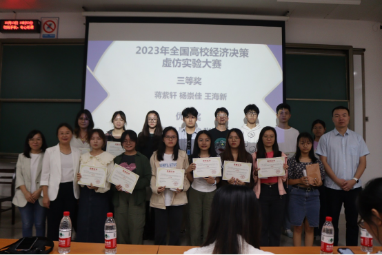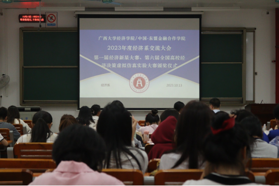 “2023年度经济系师生交流大会暨第一届经济新星大赛、第六届全国高校经济决策虚拟仿真实验大赛颁奖仪式”在六教6B-101室顺利举办。经济学专业四个年级的同学以及院长助理盛玉雪老师、经济系主任郭南芸老师、经济211班班主任杨祯奕老师、经济类223班班主任彭晴老师、经济231班班主任覃诚老师参与此次活动。