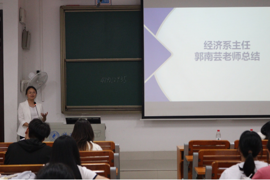 大会第四项议程由经济系主任郭南芸老师对大会进行总结。郭南芸老师表示此次交流大会既让同学们加深了对经济学专业的认识,又通过经验传授,明确了未来学习方向,有利于发现自身不足、提升优势、相互学习,增进友谊。同时,今年举行的第一届经济学专业“经济新星”大赛很成功,通过大赛,增强了同学们科研和实践的热情,并极大挖掘了同学们的学术、竞赛潜力,希望明年将有更多的同学参与到“经济新星”大赛来。郭老师还建议同学们珍惜大学生活,多交朋友,多向身边同学学习,多思考,希望同学们能在今后的道路上越走越好。