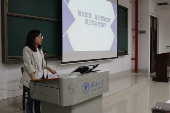 大会第一项议程为院长助理、经济系副主任盛玉雪老师致辞。盛玉雪老师表示近年来越来越多的同学选择经济学,不少高分的同学将经济学作为自己的第一志愿,而如何学好经济学成为同学们需要思考的一大问题。为此特地举办此次交流大会,希望能加深同学们对经济学专业的认识,帮助同学们尽早树立自己在大学阶段的目标、更好的适应大学生活。最后她还强调,在学习的道路上,要不断积极尝试和探索,做勇敢的经济人。