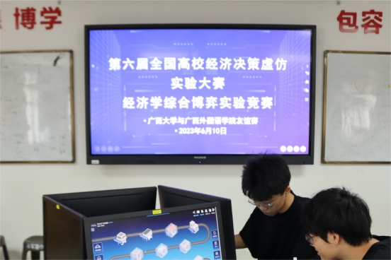 院长助理、经济学系副主任盛玉雪,经济系主任郭南芸召集,广西外国语学院国际经济与贸易系主任孙西楠等四位老师带队参赛,两校共计50余名参赛队员一起度过了一个充实的周六。