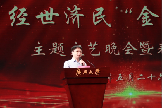 活动伊始,学院党委陆善勇书记为晚会致辞。陆书记向现场师生阐释了“经济”的汉字溯源和涵义演化,希望同学们深刻理解其中蕴含的治理世事安定民生之意,树立远大理想,心怀家国天下,传承红色基因,勇担责任使命,真正践行今晚的主题“经世济民跟党走,‘金’彩青春绽光芒”。