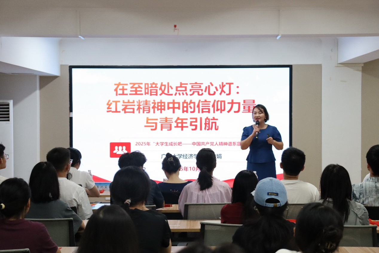 “同心铸梦”辅导员工作室负责人刘梦娟老师以“在至暗处点亮心灯:红岩精神中的信仰力量与青年引航”为题,从信仰的纯度、智慧与共鸣三个维度深入阐释了红岩精神的内涵。她引导同学们感悟“狱中八条”对当代青年的重要启示,并号召同学们在面对学业挫折与价值迷茫时,应能够将个人理想融入国家发展大局,共同凝聚力量助力中华民族伟大复兴。