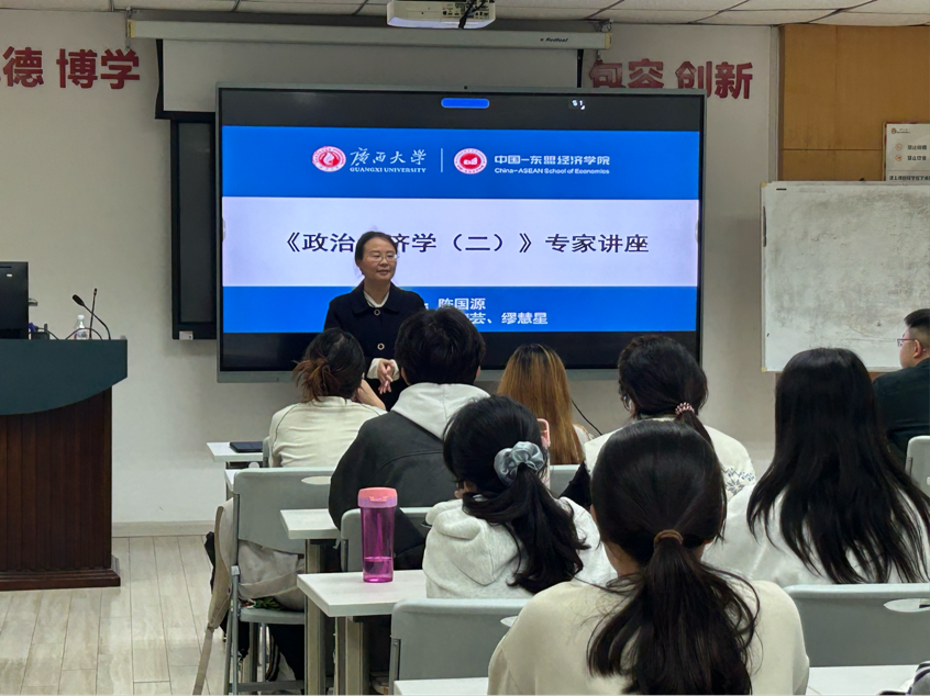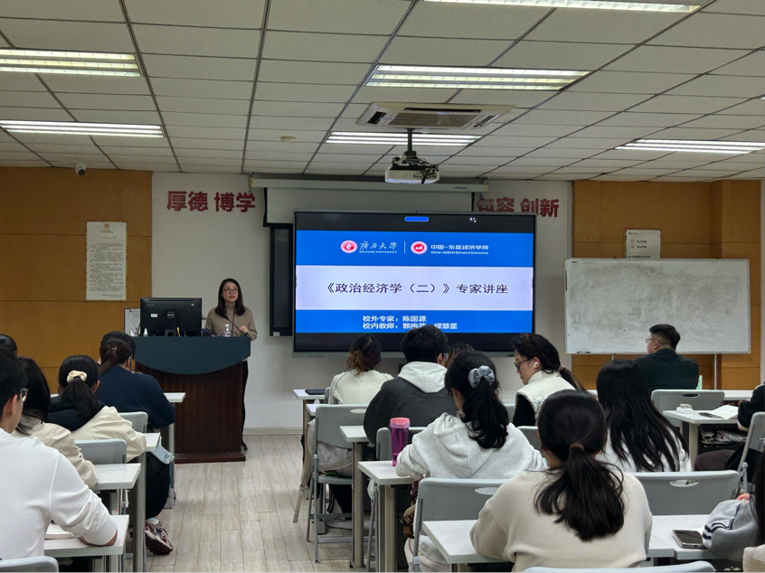 随着时代发展,深化产教融合,促进教育链、人才链与产业链、创新链有机衔接,已成为高校培养高素质创新人才的重要途径。为拓宽学生学术视野,洞察行业发展脉搏,将最鲜活的市场实践引入校园,2025年12月23日晚,经济学专业于MBA大楼613教室举办《政治经济学(二)》校企共授课程专家讲座,特邀南宁市青秀区直属国企广西南宁昇达资产投资有限公司副总经理陈国源围绕民营企业治理和民营经济发展作了题为“恒大公司治理失败的警示与反思”的讲座。讲座由任课教师缪慧星副教授主持,经济学系主任郭南芸共同出席,熟女