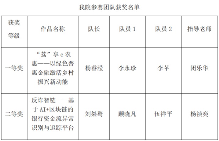 学子凭借扎实的专业功底和出色的现场表现脱颖而出。最终,由闭乐华老师指导,杨睿滢、李永珍、李苹组成的团队凭借作品《“荔”享e农惠——以绿色普惠金融激活乡村振兴新动能》荣获赛区一等奖;由杨祯奕老师指导,刘桀骜、顾晓凡、伍祥平组成的团队凭借作品《反诈智链——基于AI+区块链的银行资金流异常识别与追踪平台》斩获赛区二等奖。