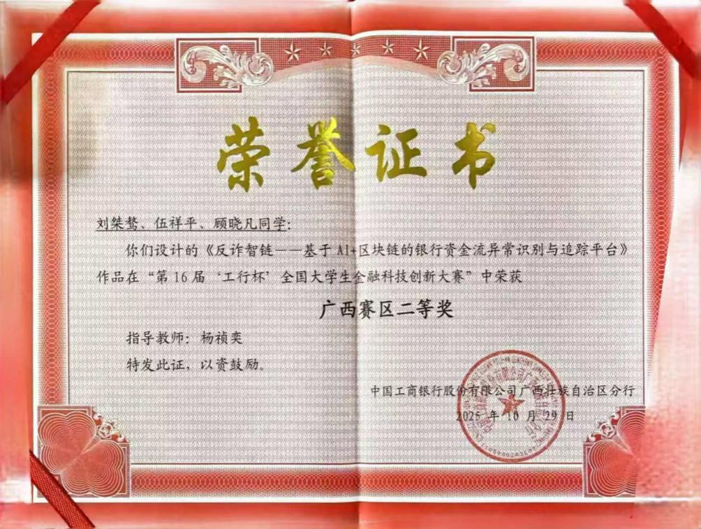 “反诈智链”团队荣获第16届‘工行杯’全国大学生全融科技创新大赛广西赛区二等奖
