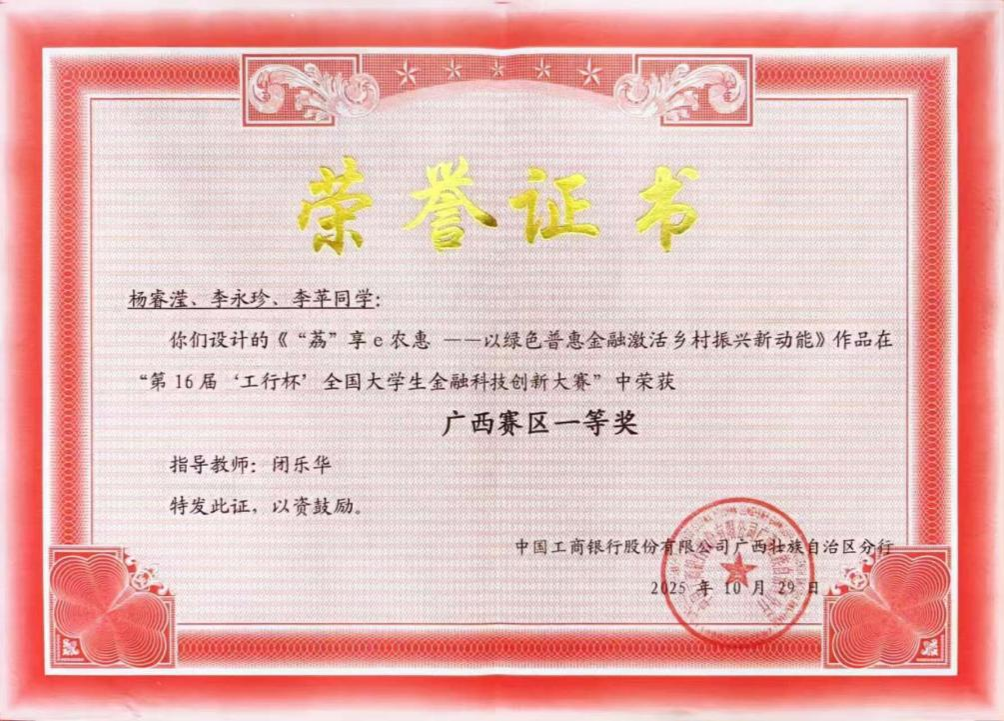 “‘荔’享e农惠”团队荣获第16届‘工行杯’全国大学生全融科技创新大赛广西赛区一等奖
