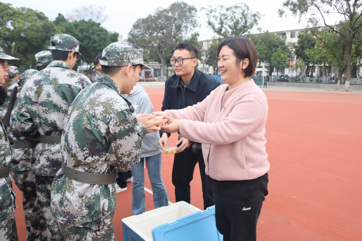 党委书记姜玮、党委副书记刘梦娟、副院长公正带领全体专兼职辅导员,深入训练一线,亲切看望正在参加军训的2025级新生,为他们送上热气腾腾的汤圆和深切的关怀。