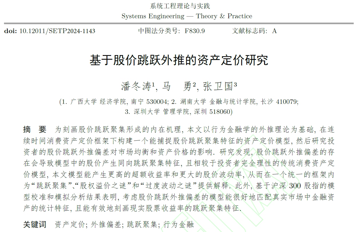 潘冬涛助理教授与湖南大学马勇教授、深圳大学张卫国教授合作的论文《基于股价跳跃外推的资产定价研究》在《系统工程理论与实践》期刊上网络首发。潘冬涛助理教授为论文第一作者,马勇教授为论文通讯作者。