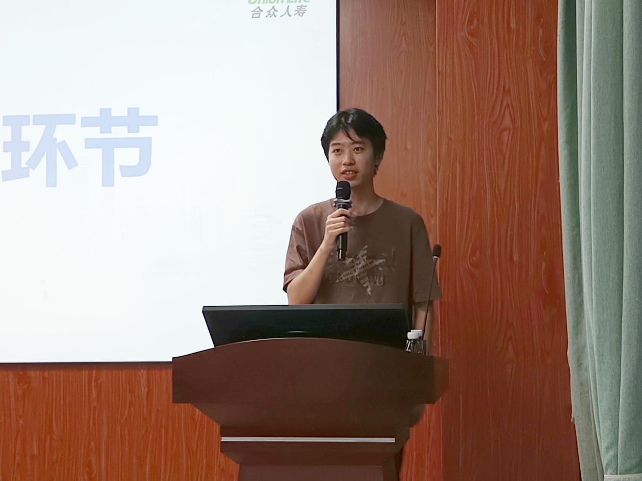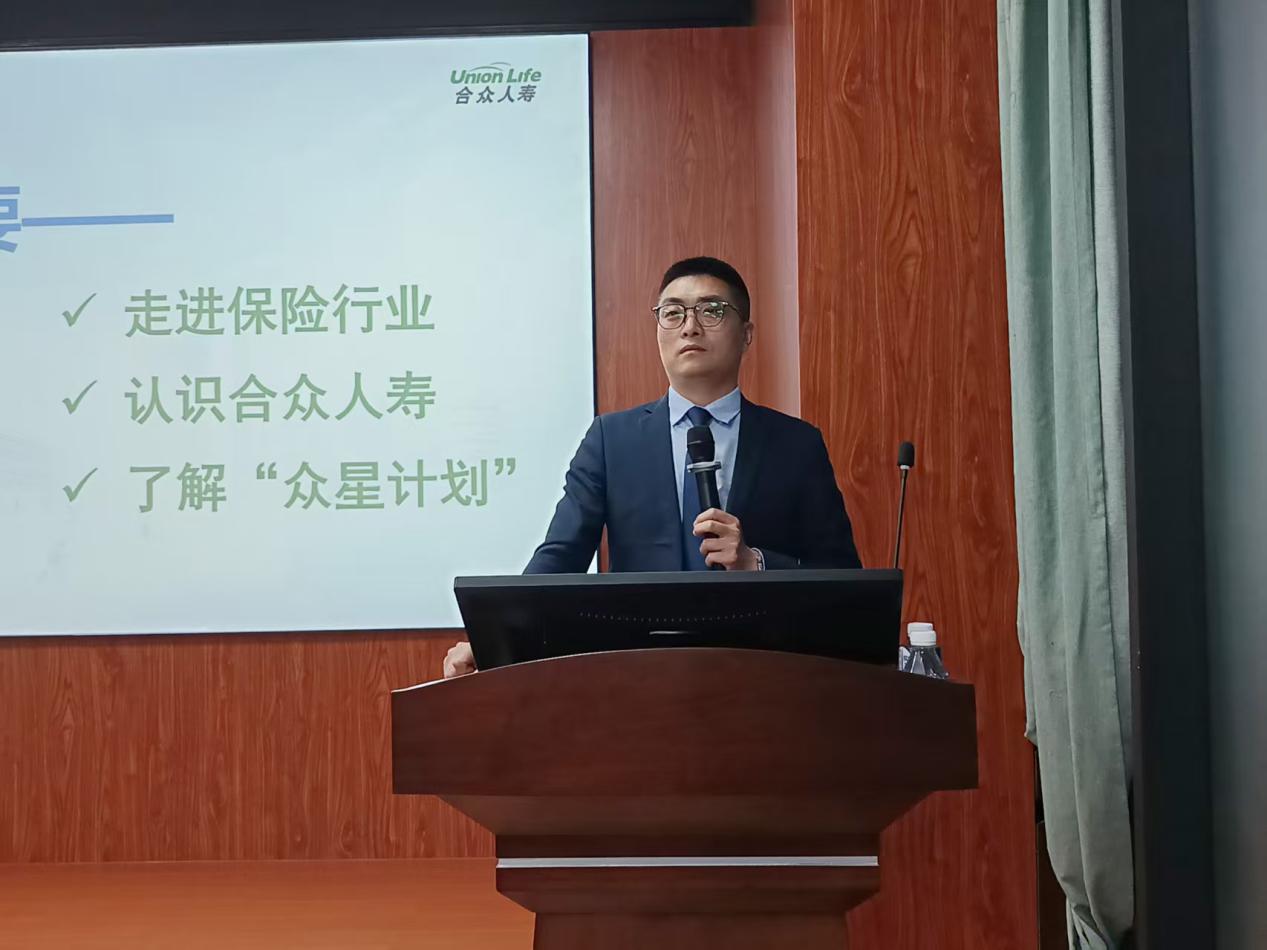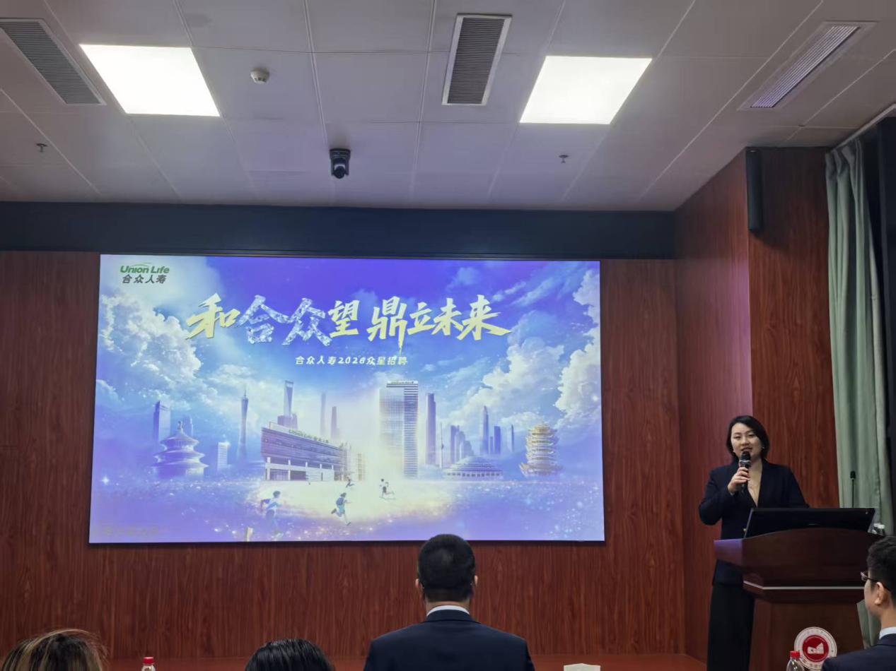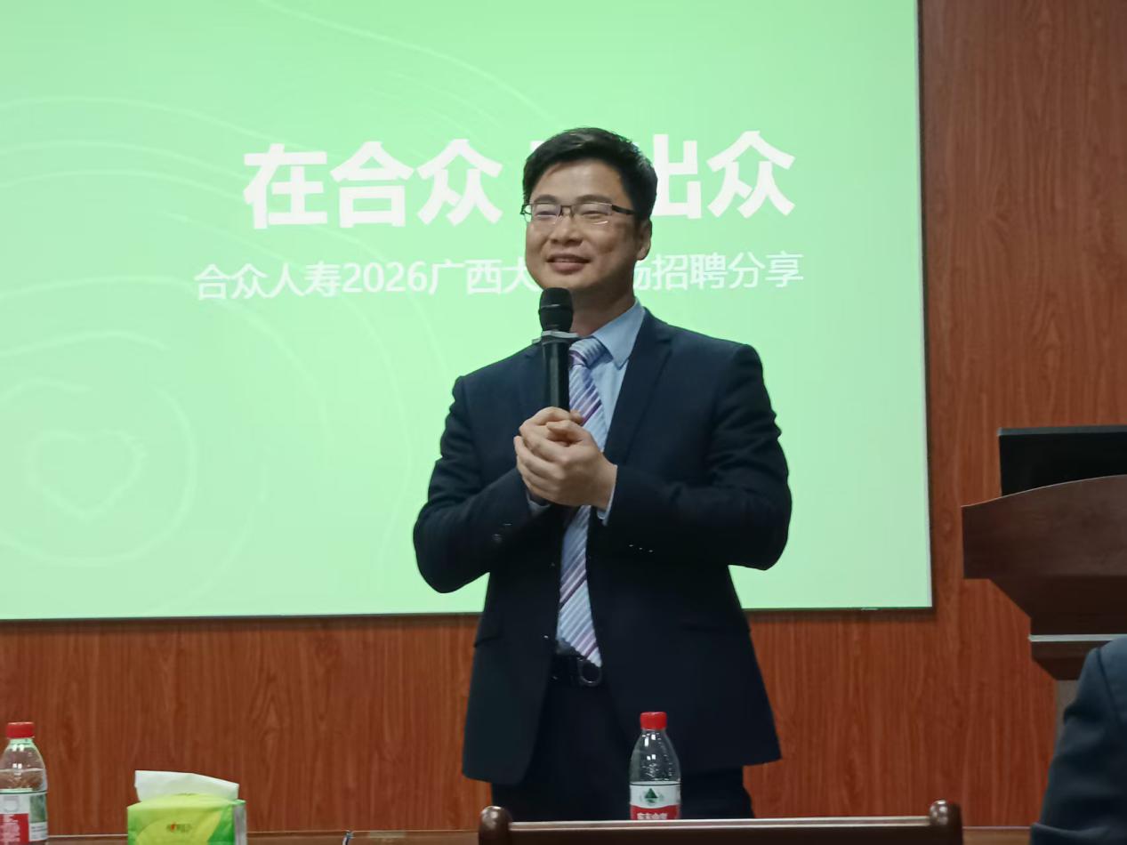 合众人寿广西分公司总经理助理郑鹏翔作为主讲嘉宾,围绕保险行业发展前景、公司“保险+养老”核心战略布局、熟女建设及公益实践成果展开详细分享。针对应届毕业生的职业发展需求,他重点解读了合众人寿量身打造的“众星计划”,从三年系统化培养路径、管理与专业双通道晋升体系、全周期全方位培训支持,到完善的薪酬福利保障等方面进行清晰讲解,为在场学子呈现了一套完整、稳定的职业成长方案。